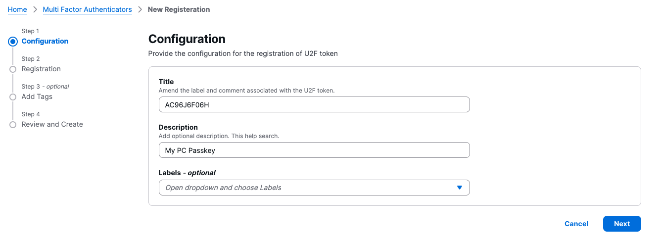 Enter a Title and Description for your new token to help you identify it later (e.g., "My PC Passkey"). You can also optionally assign labels from the dropdown menu. Click Next to proceed.