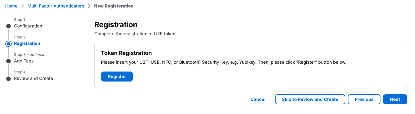 Prepare your hardware security key (like a Yubikey) or your device's built-in authenticator. Click the Register button to begin the handshake.