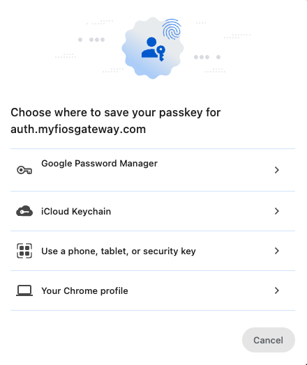 A system prompt will appear asking where you want to save the passkey. Choose from options like Google Password Manager, iCloud Keychain, a Security Key, or your Chrome profile.