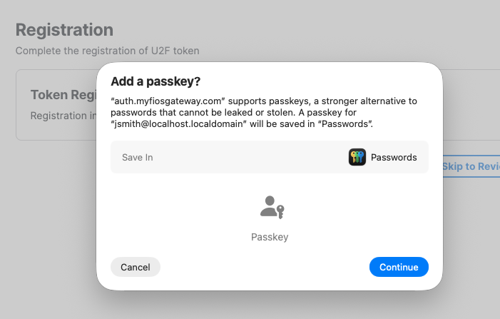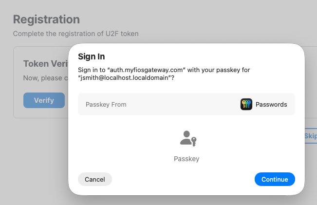A prompt will appear to sign in using the passkey you just created. Click Continue to move to the final security check.