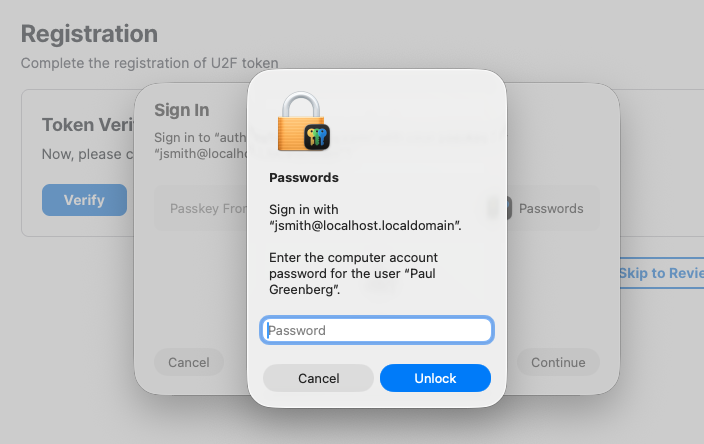 Provide your local computer account password or biometric (Touch ID/Windows Hello) to authorize the use of the passkey. Click Unlock.
