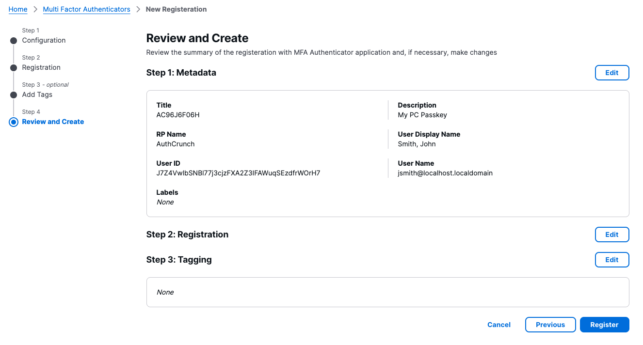 Review the metadata for your new authenticator, including the Title, RP Name, and User Name. If everything looks correct, click Register to finalize the setup.