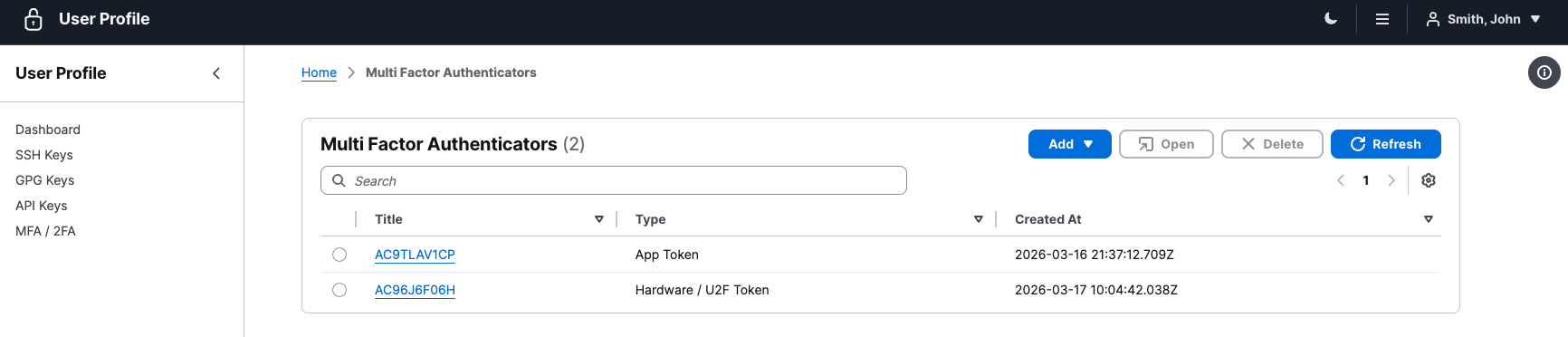You will be redirected to the Multi-Factor Authenticators dashboard. Your new Hardware / U2F Token will now appear in the list with its creation timestamp.