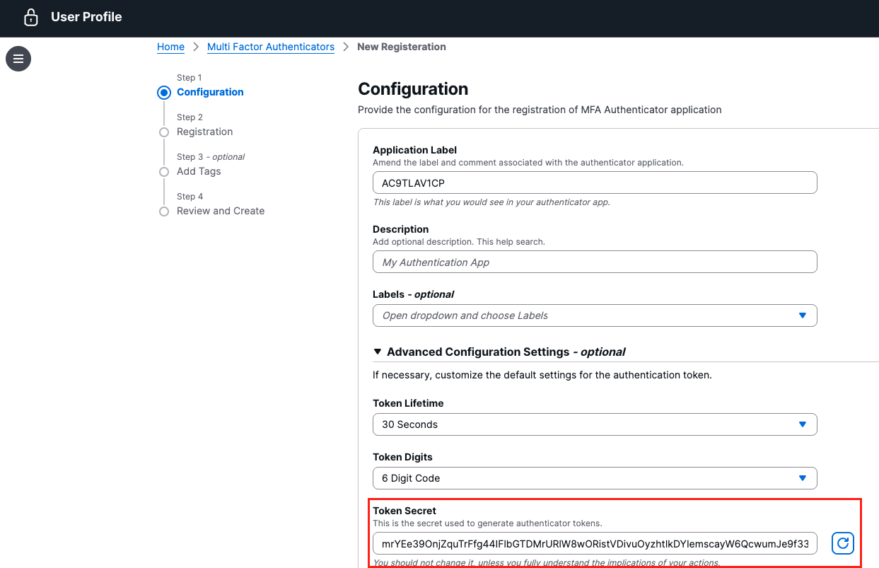 For demostration purposes, copy the "Token Secret". It could be used for automating of MFA passocode generation.